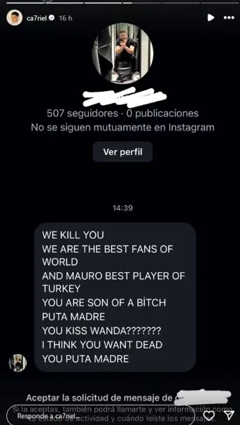Y, agregó: “Iba a subir un montón de cosas y ahora no lo voy a hacer, porque me lo merezco. Y de paso, les mando una amenacita que me gustó, ¿amenaza de muerte? Dios”. Acto seguido, el rapero subió una imagen de un mensaje que recibió por parte de un usuario, el cual le expresó en inglés: “Te matamos. Somos los mejores fans del mundo y Mauro el mejor jugador de Turquía. Sos un hijo de p…. P…. madre, ¿besaste a Wanda? Yo creo que querés estar muerto, p…. madre”.
