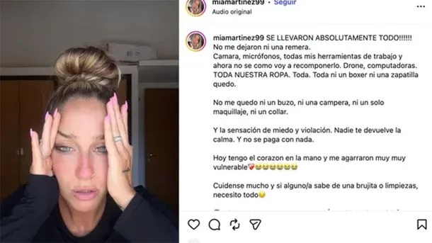 Según relató la joven, los delincuentes se llevaron “la totalidad de sus pertenencias de valor profesional, entre ellas su cámara de fotos, micrófonos y un dron”, y solo dejaron en la casa “un bóxer y una tanga”.