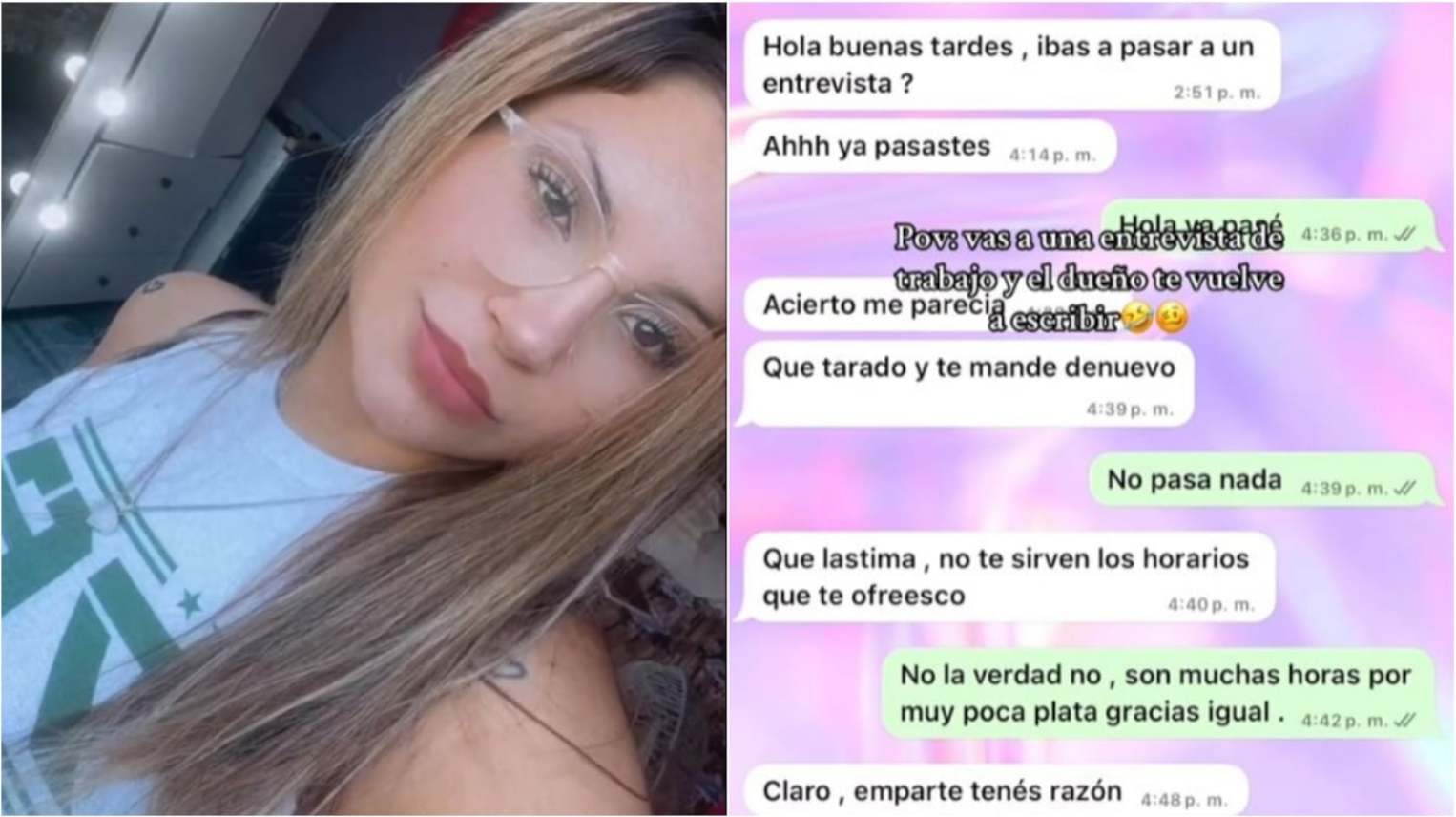 En la grabación, Ailén mostró los mensajes que recibió poco después de salir de la entrevista. El propietario le preguntó inicialmente si había asistido y, tras su respuesta afirmativa, manifestó su descontento por no haber aceptado el puesto. Ailén le explicó que el pago ofrecido no le parecía adecuado para la cantidad de horas a trabajar, pero el hombre continuó insistiendo.