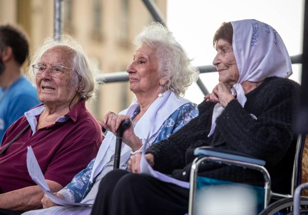 En diálogo , la titular de Abuelas de Plaza de Mayo se unió a Taty Almeida y juntas reflexionaron sobre el presente del país: «Hay mucha gente, que eso es muy importante. No es un año más, es un año… yo no sé si con esto conseguiremos defendernos de la situación gubernamental que tenemos», señaló Estela.