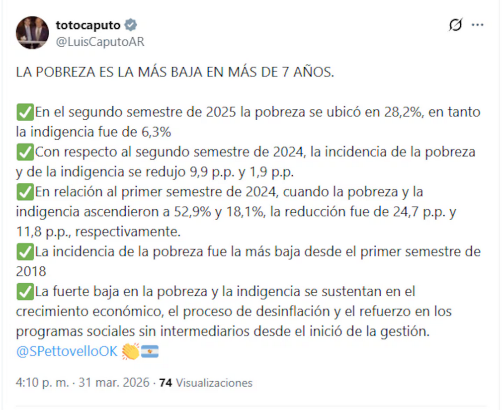 A través de redes sociales, el funcionario remarcó que, en comparación con el mismo período de 2024, la pobreza se redujo 9,9 puntos porcentuales, mientras que la indigencia cayó 1,9 puntos.