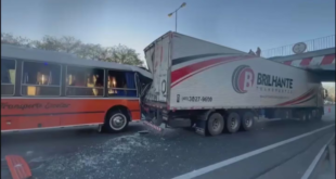El camión medía más de 4 metros de alto y quedó incrustado en el puente que tenía una altura máxima permitida de 3,80. El camión quedó incrustado en el puente y el colectivo lo chocó de atrás. Un brutal accidente se registró en horas de la mañana de este sábado …