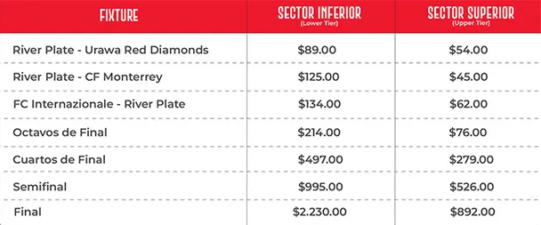 Las ubicaciones disponibles para socios de River corresponderán a las cabeceras altas y bajas de cada estadio y tendrán los siguientes precios establecidos por la FIFA: