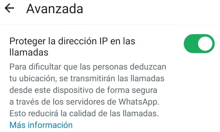 La opción secreta se llama Proteger la dirección IP en las llamadas y se encuentra dentro de la configuración de privacidad de la aplicación. Al activarla, se evita que tu dirección IP sea compartida con otros usuarios cuando hacés llamadas de voz o videollamadas.